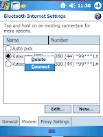 17. все, налаштування завершено (причому читати цей текст набагато довше, ніж налаштовувати). в списку у вас, скоріше за все, буде один профіль з'єднання київстар (bt) (на скріншоті -- два профілі і перший пункт auto pick, який вибирати, як правило, не слід). довгим тапом на нашому профілі відкриваємо меню, і в ньому вибираємо пункт connect -- кпк починає з'єднуватися з телефоном через bluetooth, телефон конектиться через gprs (хоча залежить він налаштувань телефона!), і... ми в мережі.