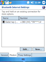 3. віконце bluetooth internet settins (або my isp) -- скоріше за все, ніяких налаштувань тут ще немає (на скріншоті вже єсть один профіль, київстар (gprs)), тож створюємо новий: тиснемо кнопку new.