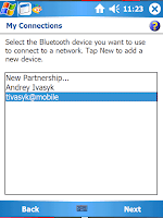 5. віконце my connections -- якщо вибрали тип з'єднання bluetooth, далі система попросить нас вказати, який спарований пристрій треба використовувати як модем (дивимося вище -- кпк і телефон мають бути спаровані), на цьому екрані вибираємо зі списку свій телефон (на скріншоті -- tivasyk@mobile). тиснемо next, система шукає пристрій і за необхідності вимагає код доступу (дивимось також на екран телефона).