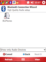 тепер вмикаємо bluetooth кишенького пк, і відкриваємо менеджер bluetooth: перша сторінка буде пустою, кпк ще не знає інших пристроїв. тиснемо new -- і у наступному віконці вибираємо пошук бездротових пристроїв аудіовідтворення (high quality audio setup). тиснемо next -- кпк відобразить перелік готових для підключення навушників у радіусі дії модуля bluetooth, -- вибираємо свої навушники. наступний екран: налаштування з'єднання, залишаємо галочки як єсть (створити значок у менеджері bluetooth, використовувати безпечне, зашифроване з'єднання), за бажання редагуємо назву для значка, finish.