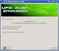 ! коментар. юрій новоставьский підказує технічно більш правильний -- з огляду на безпеку й надійність -- спосіб запуску інсталятора. ключовий момент: варто запускати консоль не з правами адміністратора, а з правами користувача. тоді командаколи встановлення завершиться, інсталятор покаже у віконці інформацію про те, в яку теку встановлено гру (як правило /usr/local/games/ufoai/) та якою командою її запускати. втім, зручніше знайти відповідний рядок у головному меню, або створити його самим (про це якось іншим разом). зараз же можна запустити гру, просто натиснувши клавішу start у тому ж віконці. так і робимо...
