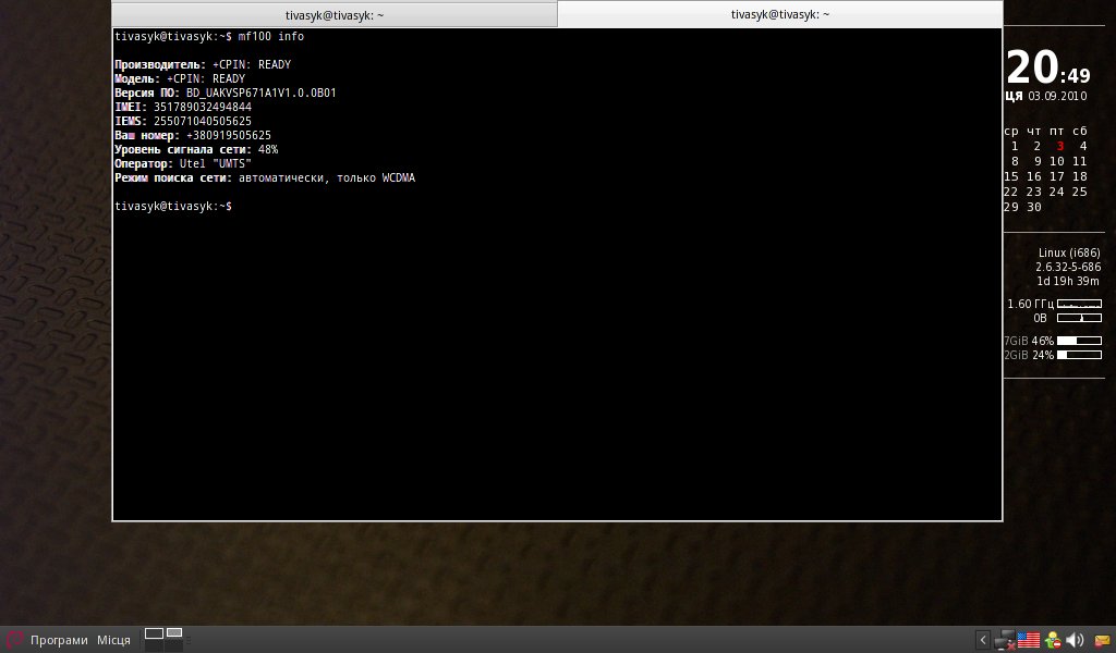 готово. далі все просто: підключаємо модем zte mf100 (для нього писалося — але ймовірно, що працюватиме з якимись іншими подібними моделями), трішки чекаємо, поки на нім загориться зелений індикатор, і пробуємо в терміналі:mf100 info