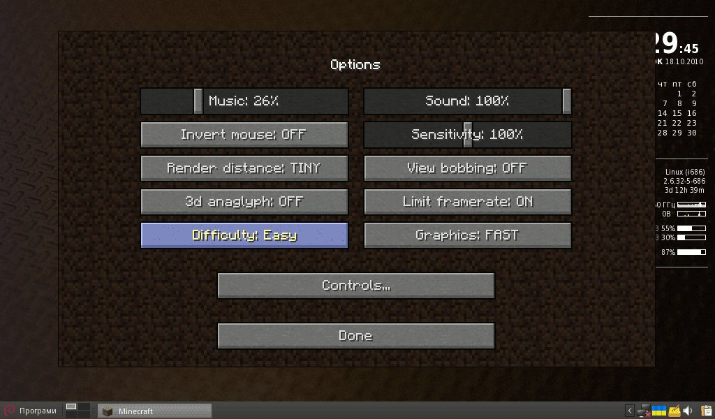 після цього загрузчик має запуститися нормально. у віконці з полями для вводу логіна/пароля для мережевої гри — залишаємо поля пустими (!) і тиснемо login. коли з’явиться меню, для нетбука в налаштуваннях (options) необхідно вибрати мінімальну дистанції видимості (render distance: tiny) та мінімальну якість графіки (graphics: fast), інакше буде слайдшоу.після того, як робінзона раз чи два з’їдять зомбі — повертайтеся читати далі =)