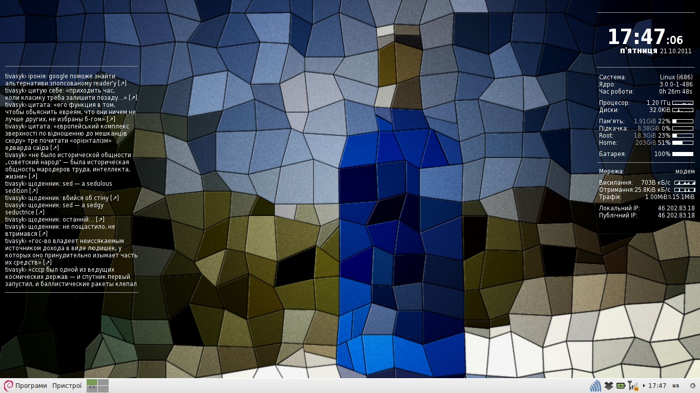 з тексту очевидно, що результат роботи скрипта — відформатована стрічка з рядками не довше 40 символів, — збережена в файлі ~/conky/.twitter_archive. сам скрипт twitter_read.sh зручно тримати в тійже теці.запустити скрипт і вивести стрічку на стільницю (точніше, лише перші 30 рядків, на жаль) можна таким рядком в конфігу conky: