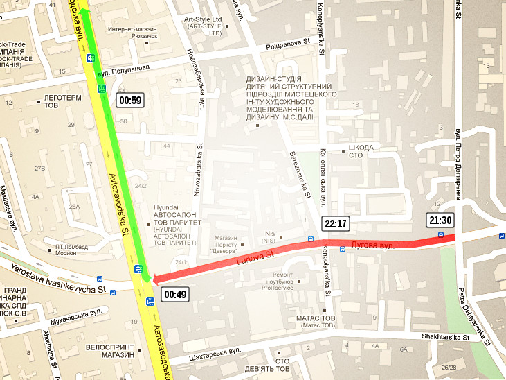 вже перед самим перехрестям зауважую, що якщо до цього часу я практично стояв, посуваючись втім час від часу на півкорпуса чи корпус — то за перехрестям колона в сторону виноградара просто стоїть, непорушно. тим часом автозаводською якісь поодинокі автівки їдуть. пригадую, як один колега, що живе неподалік і завжди їздить додому великою окружною, виїжджаючи з офісу о шостій знову згадував добрим словом окружну, мовляв, її вже розкатали. гаразд, міркую, спробуємо, — і вирулюю на автозаводську в напрямку полярної, площі шевченка та мінського проспекту. на годиннику нуль нуль сорок дев’ять.