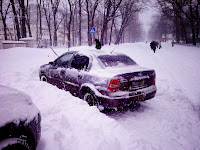мені варто було попередньо поцікавитися ситуацією на вулицях, відкривши яндекс, і поїхати на метро, залишивши автівку на парковці. але я все ще не переймався ситуацією.отож о пів на восьму я збираюся й виходжу. автівку замело снігом, але не надто сильно — від завірюхи її почасти захищає велика будівля бізнес-центру та висока огорожа поблизу; шар снігу з цього боку будівлі — лише близько 15-20 см, тож я не панікую.