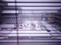 трохи згодом, о четвертій, я знову роблю знімок через вікно — снігопад посилився, надворі справжня завірюха, і працівники бізнес-центру бігають з шуфлями за тракторцем, який намагався розчищати двір, і періодично відкопують його самого.