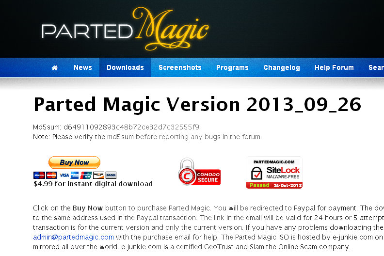 на жаль, стару версію кудись подів — пішов на сайт parted magic, щоби завантажити… в очі кинувся новий логотип і кнопочка buy now від paypal. у файлах на sourceforge також залишився лише readme.