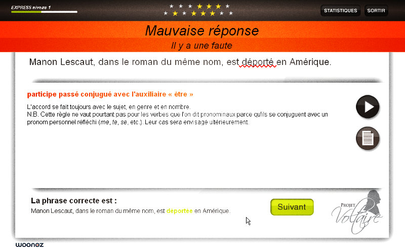 це онлайновий інструмент для тренування французької орфографії. реєстрація безкоштовна, — після цього протягом року користувачеві доступні онлайнові вправи з тренування граматики. на початку система дає невеличкий тест і визначає проблемні галузі, згодом мірою виконання вправ адаптується до рівня студента.