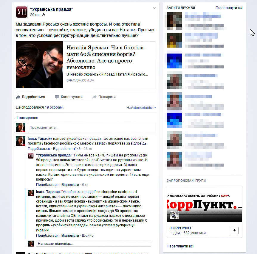 цитата | «1) мы не все на фб пишем на русском 2) до 50 процентов наших читателей на фб читают на русском языке. и это не россияне. это наши с вами соседи и друзья. 3) наша первая страница - и так будет всегда - выходит на украинском языке. кстати, единственные в украинском интернете. 4) есть еще вопросы?» (facebook)