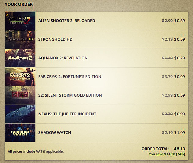 для прикладу: трилогія fallout — $9,99; grim fandango — $5,09; far cry 2 — $0,99 і так далі… на додачу — безкоштовний бонус за покупку від $5!