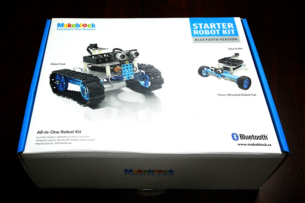 навіть і не пригадаю, звідки в мене таке в голові сиділо, але я приблизно уявляв собі, що треба шукати. трохи погугливши та почитавши, спинився на makeblock, а серед їх продуктів — на комплекті starter robot kit: в одній коробці все, що треба для збирання гусеничного «марсохода» на базі arduino, з керуванням по bluetooth, можливістю додавати модулі та з доступом до вихідних кодів програми. ну чи ж не мрія?