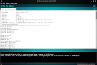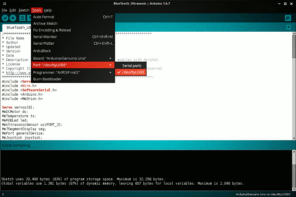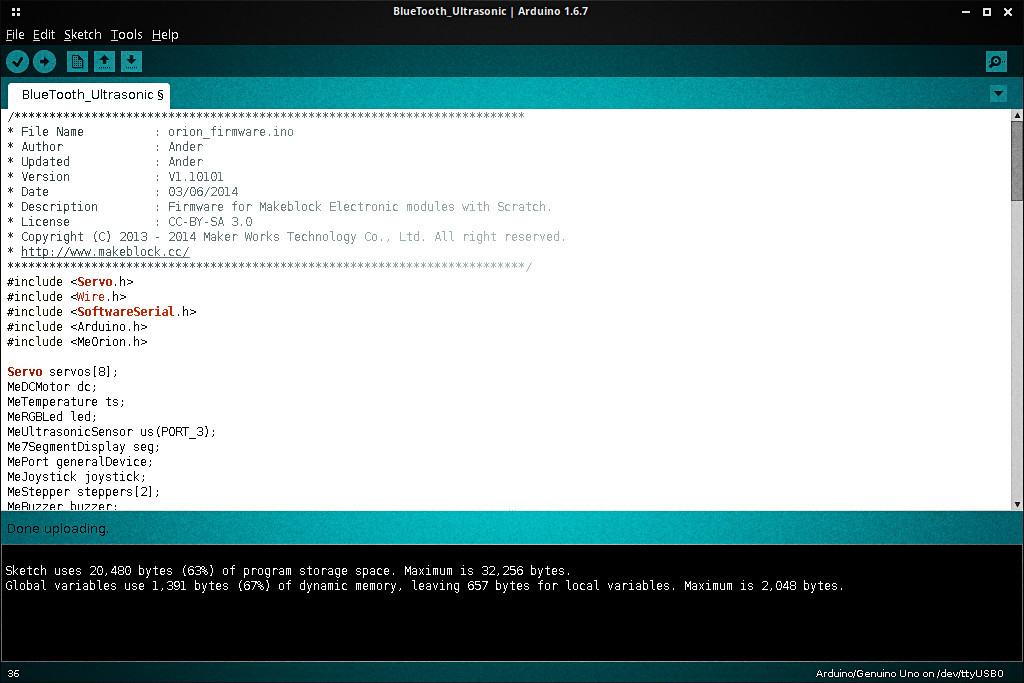 тепер можна завантажити вихідний код програми для робота — шукаємо в головному меню пункт file > examples > makeblockdrive > example > firmware_for_starter > bluetooth_ultrasonic, і текст програми з'явиться у (новому вікні) arduino ide. згодом в цьом коді можна спробувати розібратися, щось додати чи прибрати, але наразі нічого не чіпаю.