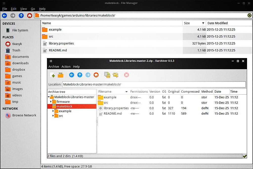 з цього місця вебсайт makeblock знову стає корисним, зокрема сторінка з інструкцією до використання arduino. зокрема зрозуміло, що до arduino потрібно додати бібліотеки makeblock для програмування основної плати та взаємодії з різними датчиками і моторами. тепер завантажую архів з github і руками переношу теку makeblock з архіва до теки libraries в інсталяції arduino на комп'ютері з linux (користувачам windows простіше — для них ці бібліотеки запаковано в інсталяцію arduino від makeblock).далі треба підключити робота кабелем до usb комп'ютера, не забувши попередньо відключити модуль bluetooth (робот тихенько цвірінькне, якщо включено мікродинамік — див. малесенький білий перемикач біля 8 роз'єму), а на комп'ютері в терміналі перевірити, як називається відкритий для usb порт: