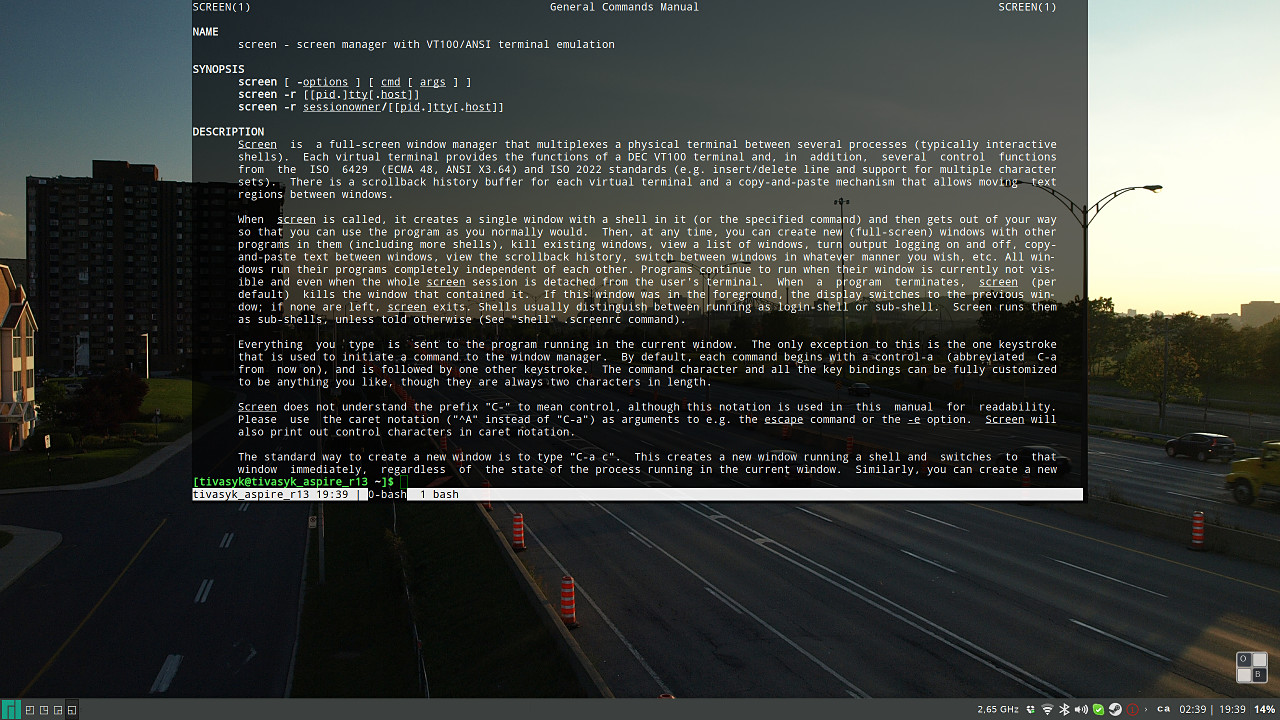 як це працює: відкриваю свій улюблений термінал (для мене це terminator в режимі консолі quake, відкривається за super+q), запускаю screen (насправді воно стартує автоматом, terminator має таку опцію) і працюю собі як зазвичай…