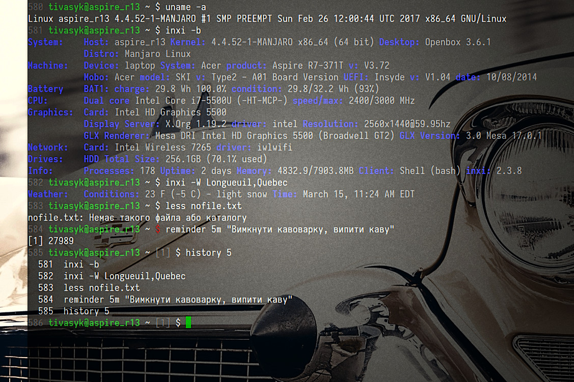 покаже десять останніх команд з номерами.звісно, найпростіше тиснути стрілки вгору (ctrl+p) та вниз (ctrl+n), якщо потрібно знайти щось дуже неглибоко в історії — гадаю, більшість початківців так і роблять (особливо ті, хто в термінал зазирає лише раз на рік, коли щось поламається).