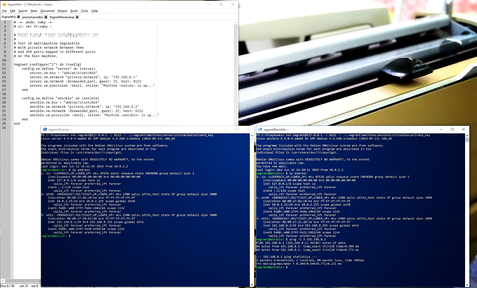 виявляється, все передбачено. додаємо преконфігурацію приватної мережі зі статичними адресами та переадресування портів — і маємо Vagrantfile (див. далі), який піднімає дві «коробки»:- server (192.168.8.1, порт 22 <- 8122 на хості)